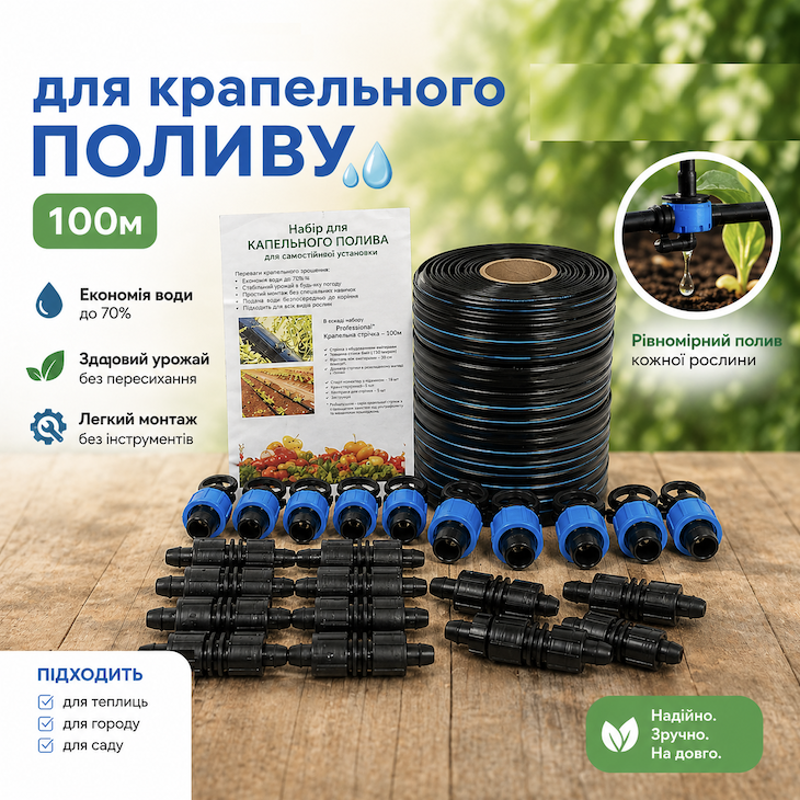 Набір для крапельного поливу 100м — це готове рішення для ефективного та економного зрошення вашого городу, теплиці або саду. Система забезпечує рівномірну подачу води безпосередньо до кореневої системи рослин, що сприяє їх швидшому росту та підвищенню врожайності.